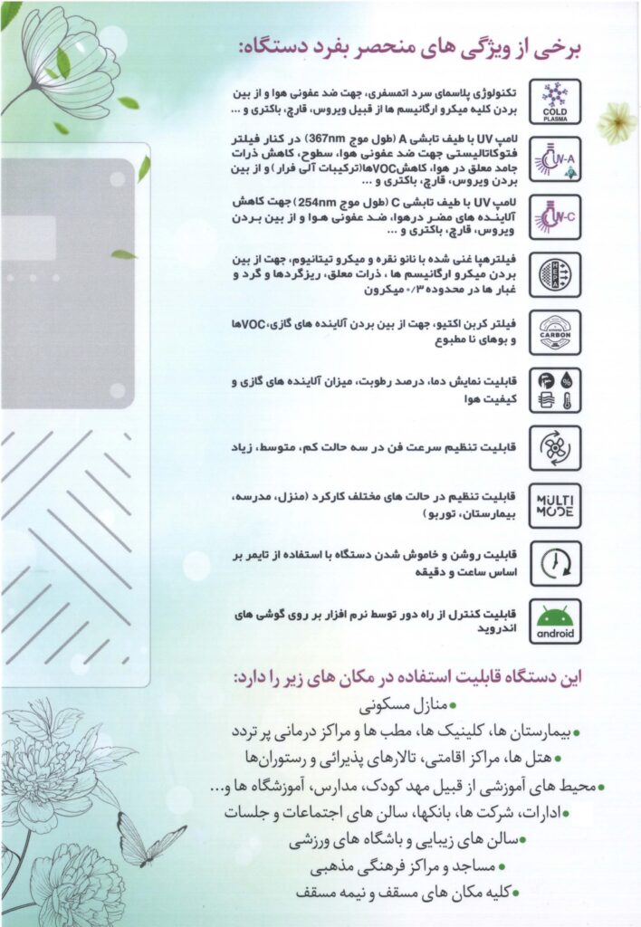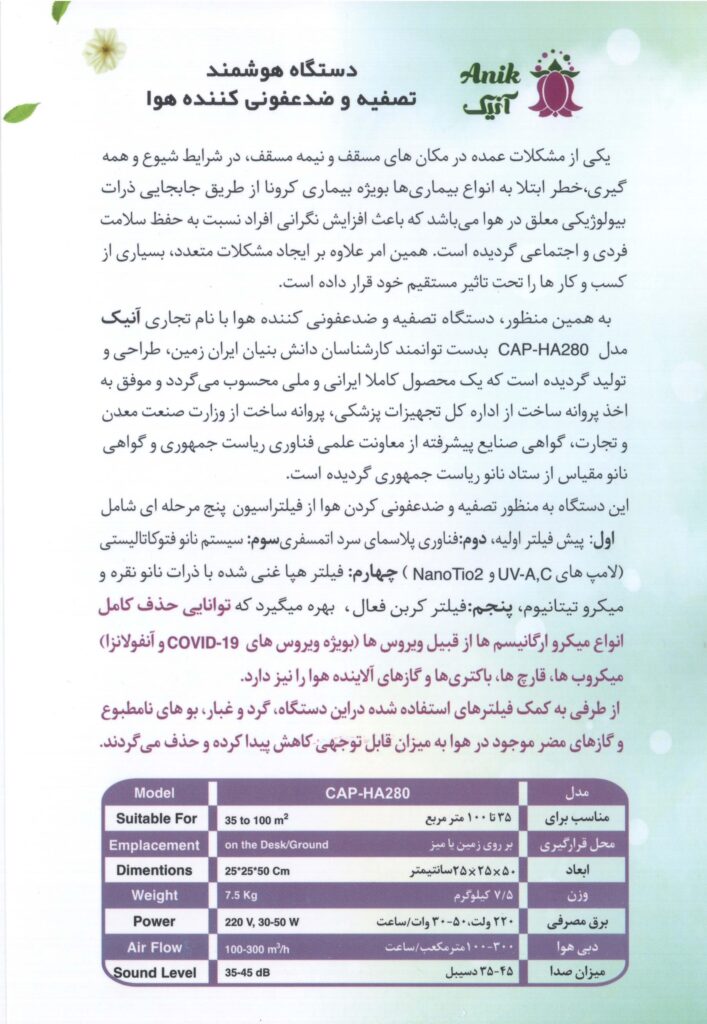 دستگاه هوشمند تصفیه و ضد عفونی کننده هوای آنیک مدل CAP-HA۲۸۰